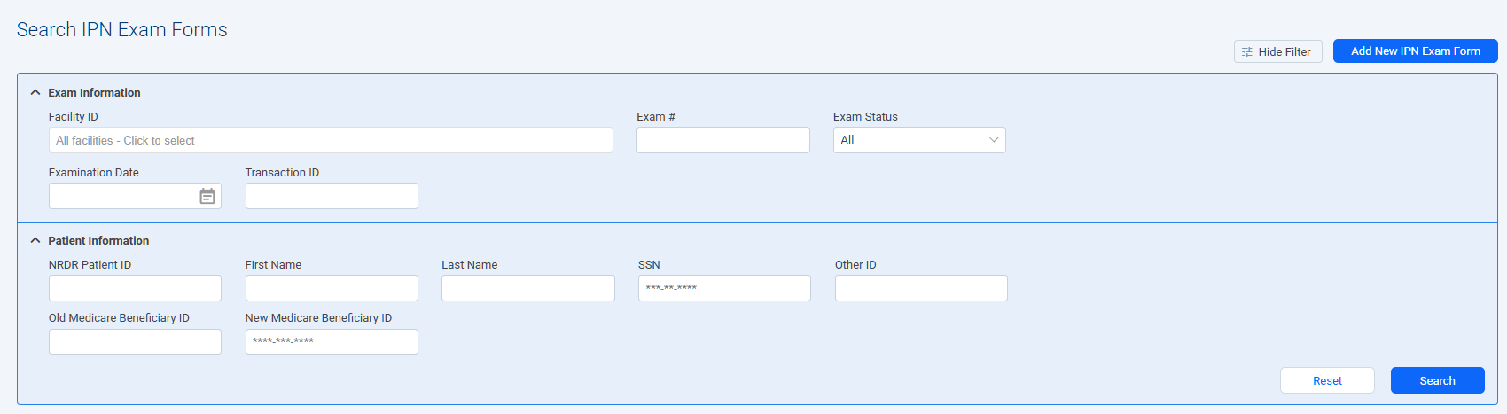 Use the search fields at the top of the page to list only exams meeting the search criteria:
